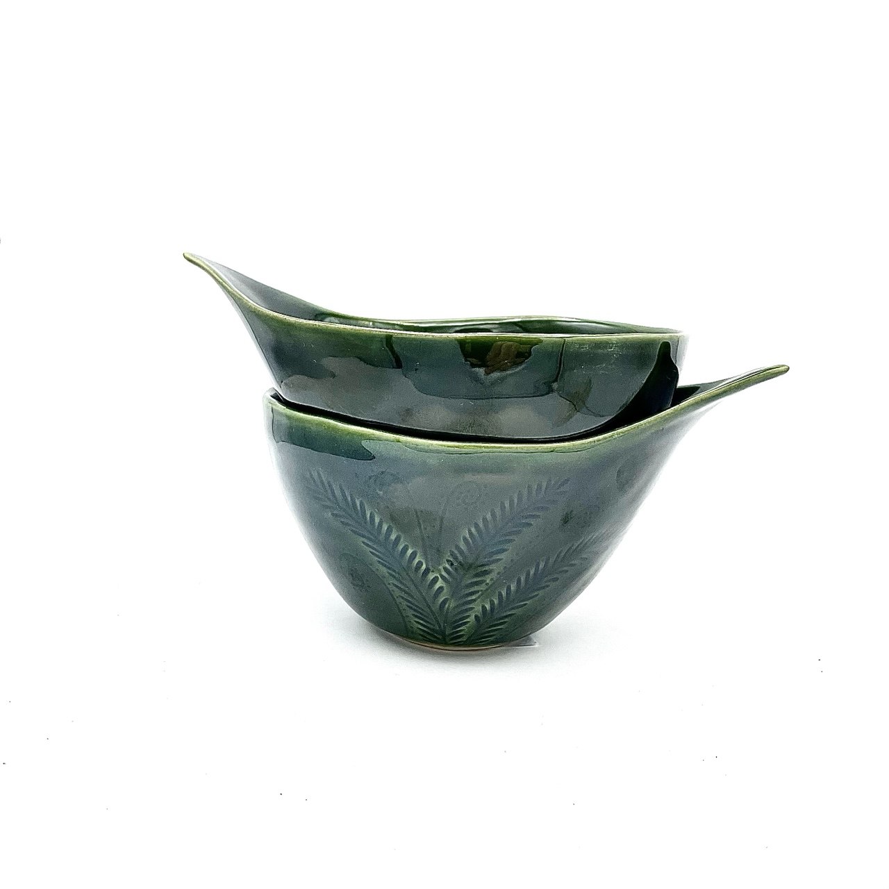 Ręcznie robiona miska kamionkowa z oryginalnym uchem w głębokim, zielonym kolorze z ręcznie wykonanym zdobieniem roślinnym przedstawiającym Kwiat Paproci. Seria Kwiat Paproci charakteryzuje się pracochłonnym, ręcznie wykonanym wzorem przedstawiającym paproć. Kwiat Paproci zakwita podczas najkrótszej nocy, tylko raz w roku. Temu, kto go ma, zapewnia dostatek i dobrobyt.