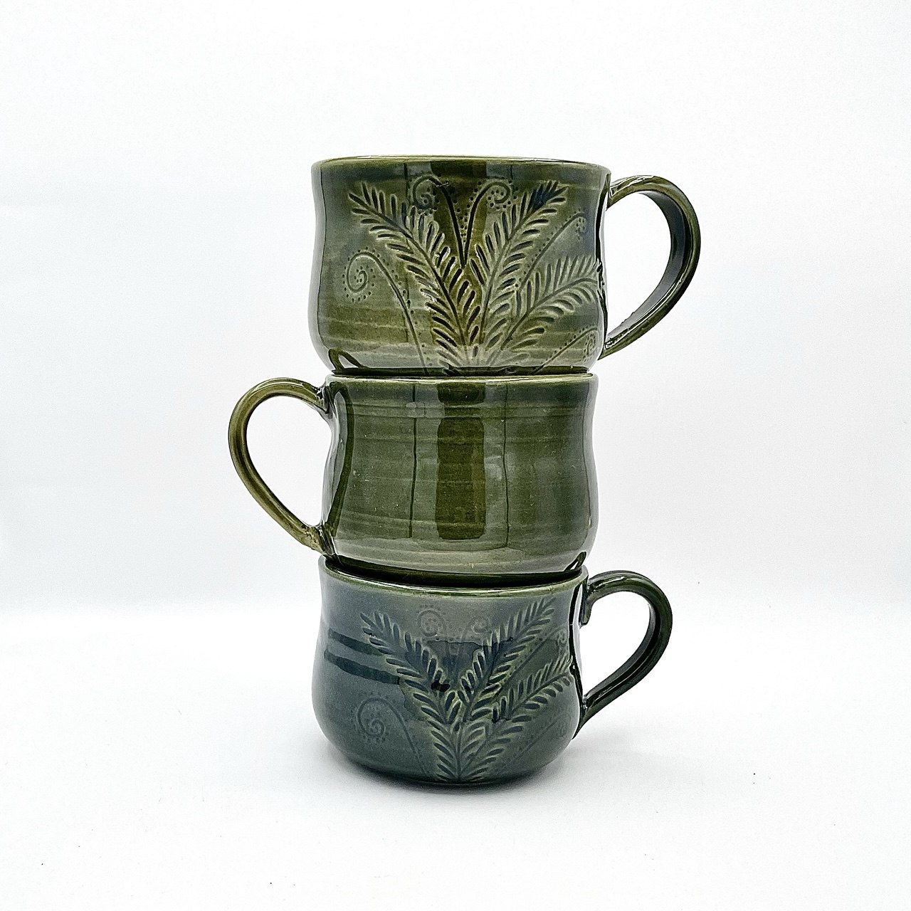 Ręcznie robiony kubek kamionkowy w kolorze ziołowej zieleni z wyraźnym motywem Kwiatu Paproci z przodu.