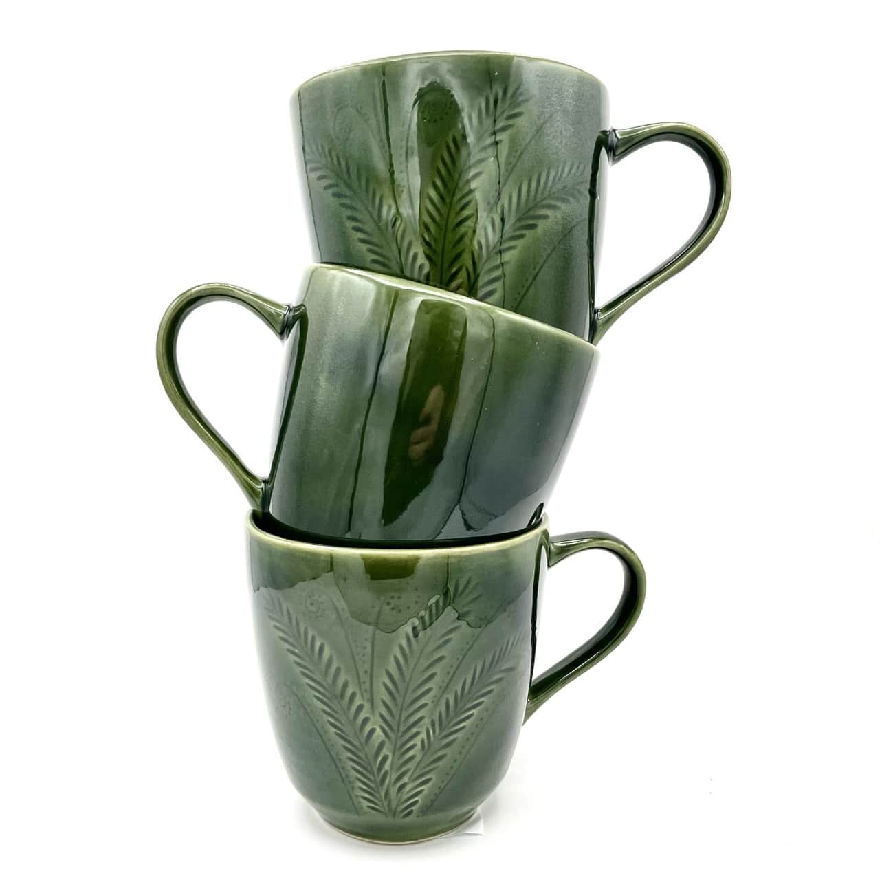 Ten kubek został wykonany tradycyjnymi technikami rzemieślniczymi z wytrzymałej kamionki. Pokryty głęboką, ziołową zielenią, nawiązuje do naturalnych barw lasu. Jego powierzchnię zdobi wzór paproci, starannie wykonany ręcznie, co sprawia, że każdy egzemplarz jest unikatowy. Dzięki temu kubek łączy w sobie funkcjonalność i wyjątkowy charakter.