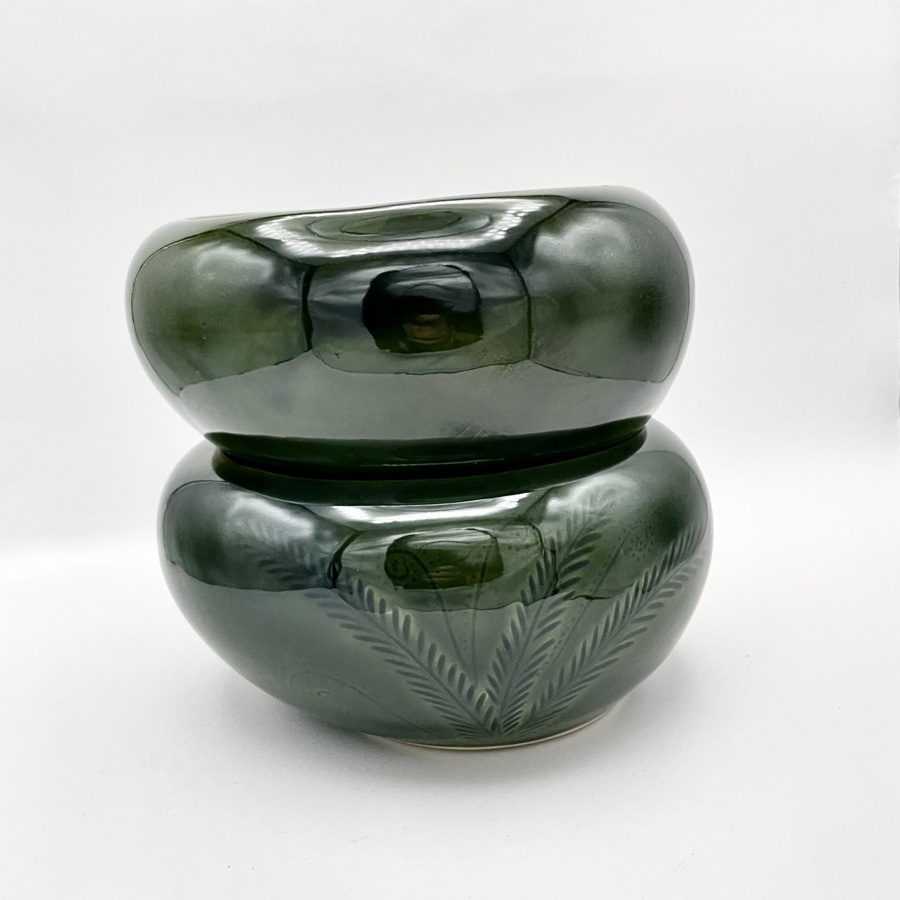 Ręcznie wykonana misa z trwałej kamionki w ziołowym odcieniu zieleni. Subtelnie asymetryczny kształt i wzór inspirowany paprocią sprawiają, że każdy egzemplarz jest unikatowy. Praktyczna i estetyczna – idealna do codziennego użytku i jako dekoracja.