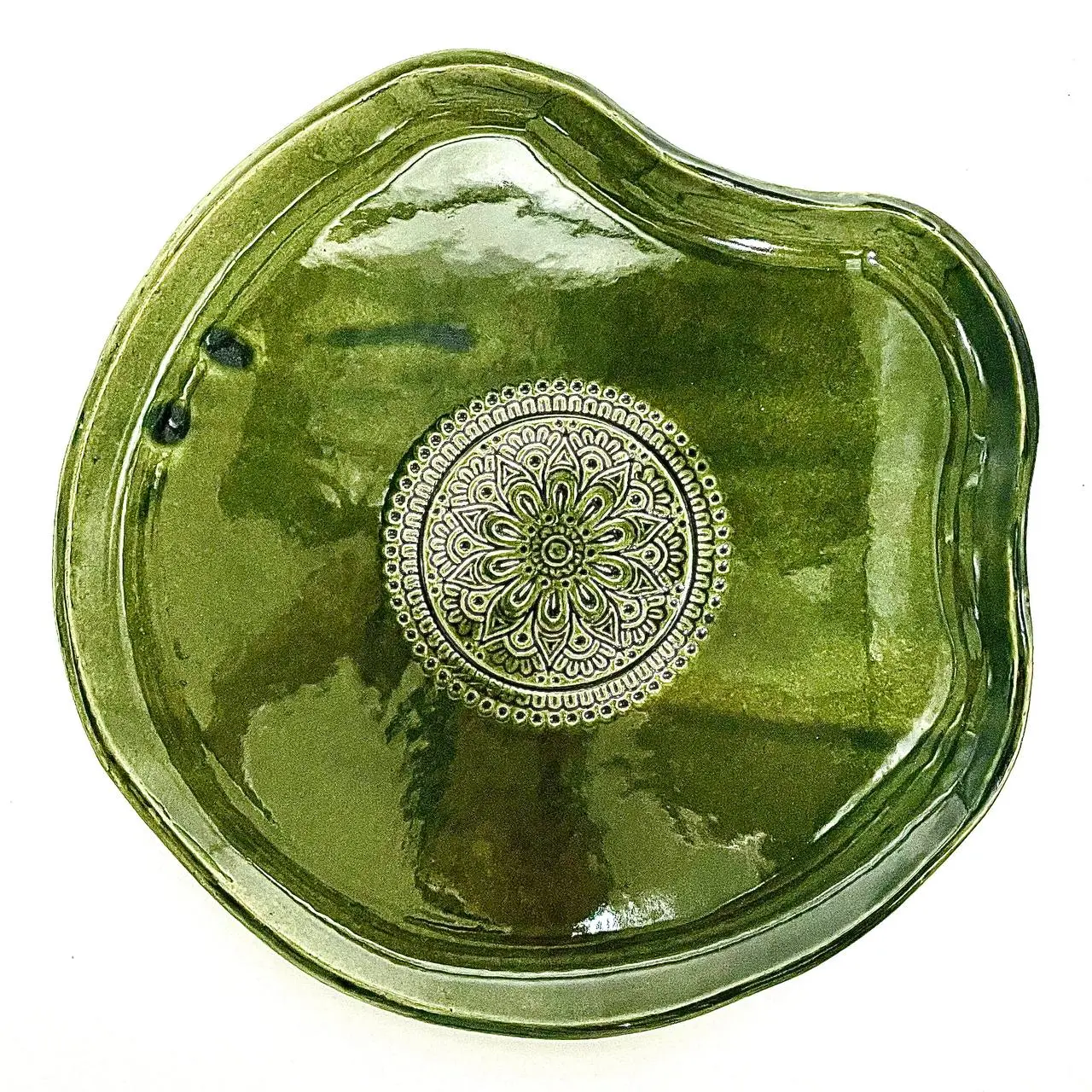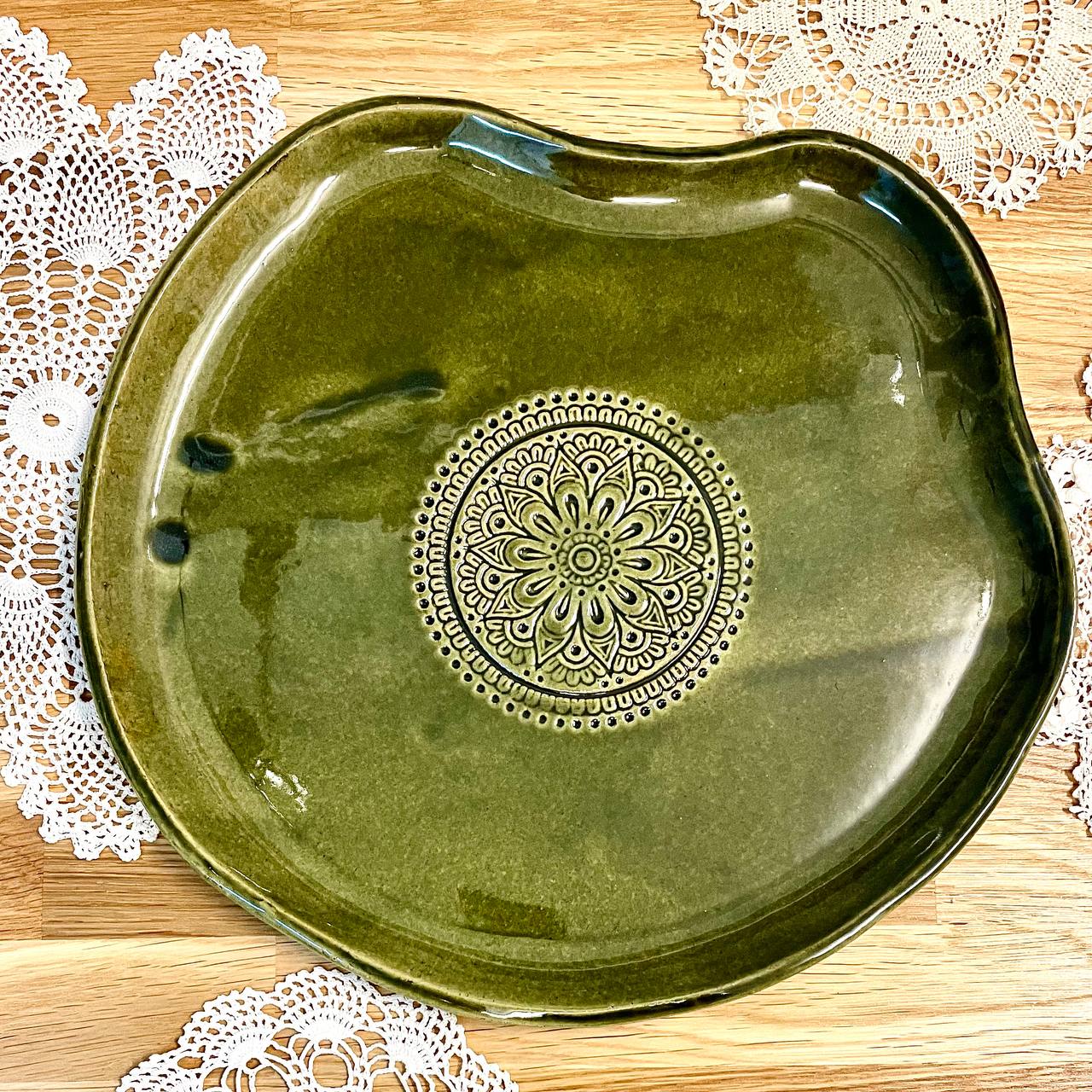 Patera Kamionkowa ze wzorem Kwiatu Paproci w pięknym, głębokim ziołowym kolorze. Idealna do serwowania ciast, owoców, przekąsek oraz deserów.